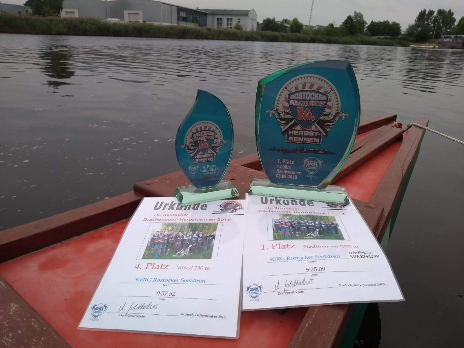 Im Nachtrennen verlief der Kurs durch den Stadthafen entlang der alten Rostocker Regattastrecke. Die 30 Sekunden-Verfolgung wies eine vermutliche Länge von etwas mehr als einem Kilometer auf. Für uns eine Chance den Wettkampf und die Saison mit einem guten Ergebnis und Gefühl zu beenden. Den Start sauber getroffen, konnten wir auf der Strecke Druck ausüben und die beleuchteten Wendemarken flogen nur so dahin. Den Heimvorteil nutzend, lieferten wir eine starke Leistung ab, die schlussendlich mit dem Sieg belohnt werden sollte. Vor den LosBanditos, die nur noch einmal im Jahr zum Nachtrennen in ein Boot steigen und den HavannaBoys feierten wir mit 05:25,09 Minuten den Sieg eines reinen KfRG-Trio. Das stellt eine Premiere dar.